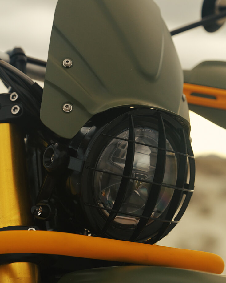 Para potenciar ese espíritu de competición off-road, se ha incluido un frontal que, acompañado de la rejilla de faro, hacen la combinación scrambler perfecta.