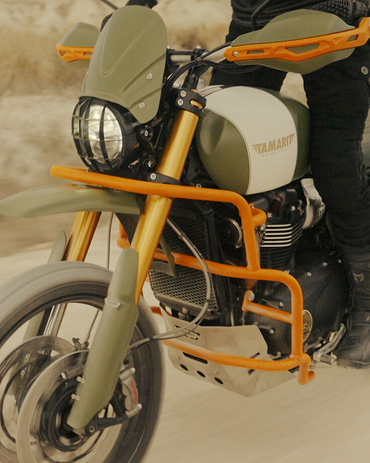 En la edición limitada Monegros se han colocado unas defensas, una estructura que protege la moto ante posibles caídas por desperfectos del camino. Preparada para todo tipo de aventuras.