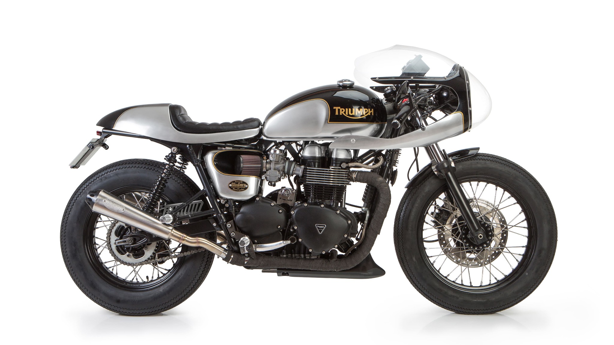 Una moto con motore Triumph Bonneville T100 e stile Cafe Racer, progettata e trasformata da Tamarit Motorcycles.